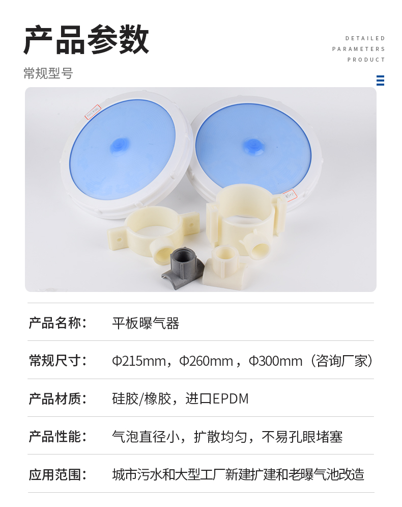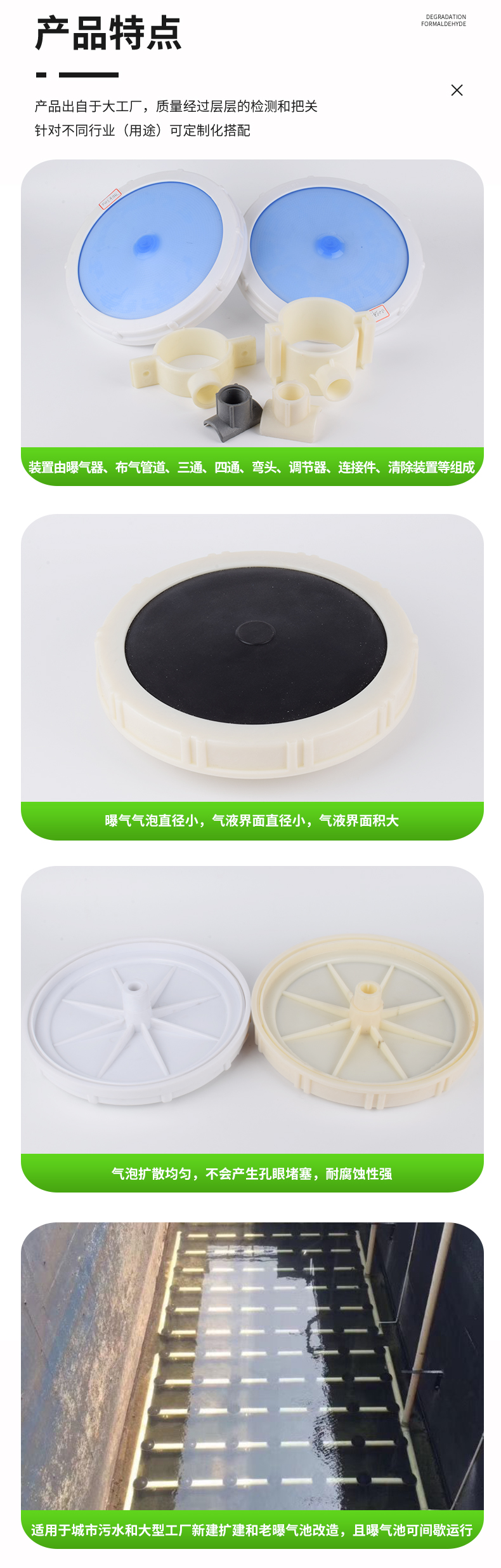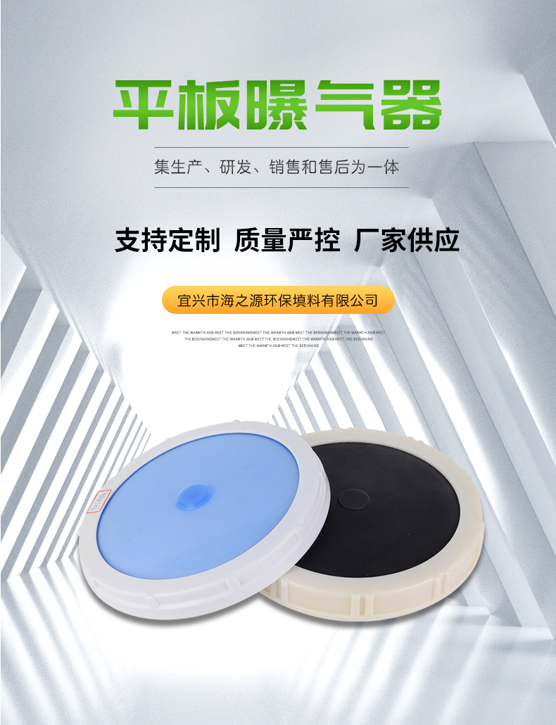 平板膜片曝氣器,該裝置曝氣氣泡直徑小,氣液界面直徑小,氣液界面積大,氣泡擴散均勻,不會產(chǎn)生孔眼堵塞,耐腐蝕性強,經(jīng)上海同濟大學環(huán)境工程學院和中國市政工程華北設(shè)計院進行清水和污水充氧測試,并經(jīng)50多家用戶多年使用效果良好(比常規(guī)產(chǎn)品固定螺旋曝氣器,散流曝氣器和穿孔管曝氣器能耗降低40%,或增加污水處理量40%)。特別適用于城市污水和大型工廠新建擴建和老曝氣池改造,且曝氣池可間歇運行。