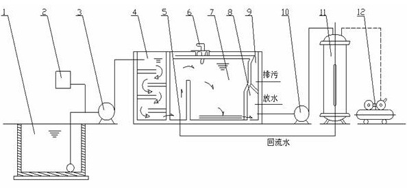 氣浮裝置的工作原理是在一定條件下,將大量空氣溶于水中,形成溶氣水,作為工作介質,通過釋放器驟然減壓,快速釋放,產生大量微細氣泡粘附于經過混凝反應后廢水中的“礬花”上,使絮體上浮,同時用刮渣機刮除,從而迅速地除去水中的污染物質,達到凈水的目的。 產品特點 1、裝置廣泛應用于造紙、印染、制革、電鍍、紡織、石油、化工、食品等相對領域; 2、在給排水處理工藝中對固液、液液和比重近于水的微小懸浮物的進行去除; 3、占地面積小,單位面積產水量高,渣體含水率低; 4、溶入的氣體經驟然減壓釋放,產生的氣泡不僅微細、粒度均勻,密度大,而且上浮穩(wěn)定,對液體擾動微小,特別適用于對疏松絮凝體、細小顆粒的固液分離; 5、加壓條件下,空氣溶解度大,供氣浮用的氣泡數(shù)量多,能夠確保氣浮效果; 6、部分回流式處理效果顯著、穩(wěn)定、并能較大的節(jié)約能耗; 7、工藝過程及設備簡單、造價低、便于管理和維護; 8、設備調試后,正常運行可達到自動化無人管理狀態(tài)。 適用范圍 1、電鍍廢水重金屬離子,如鉻、鋅、銅、鎳、鉛等總含量在50ppm以下,去除率均70%以上; 2、印染廢水的色度去除達90%左右,COD去除率達60~70%左右,BOD去除率達50%左右; 3、食品屠宰和制革廢水的COD去除率達70%左右,懸浮固體去除率達90%左右; 4、煉油廢水的油脂,可降到10mg/L以下,廢水能達到澄清程度; 5、對化工廢水和顏料油漆等,COD去除率達74%,色度去除率達93%左右; 6、造紙白水的纖維回收率可達95%左右,COD去除率達86.7%左右,清水完全回用; 7、大池沐浴水濁度可穩(wěn)定在10℃以下,水中的細菌有較大幅度下降; 8、生活飲用水及工業(yè)的濁度可凈化的5℃以下,同時對色度耗氧量降低有良好的效果。 工藝說明 本設備的工作方法屬于加壓溶氣氣浮法,其工作原理:在一定條件下,將大量的空氣溶于水,形成溶氣水,作為工作介質,通過釋放驟然減壓,快速釋放,產生大量的微細氣泡,粘附于經過混凝反應后的廢水中的"礬花"上,使絮體上浮進行清除。 1. 調節(jié)池 2. 投凝劑設備 3. 污水泵 4. 折板聚凝池 5. 釋放器 6. 刮渣機 7. 氣浮池 8. 溶氣水存放池 9. 污泥池 10. 溶氣水泵 11. 溶氣罐 12. 空壓機