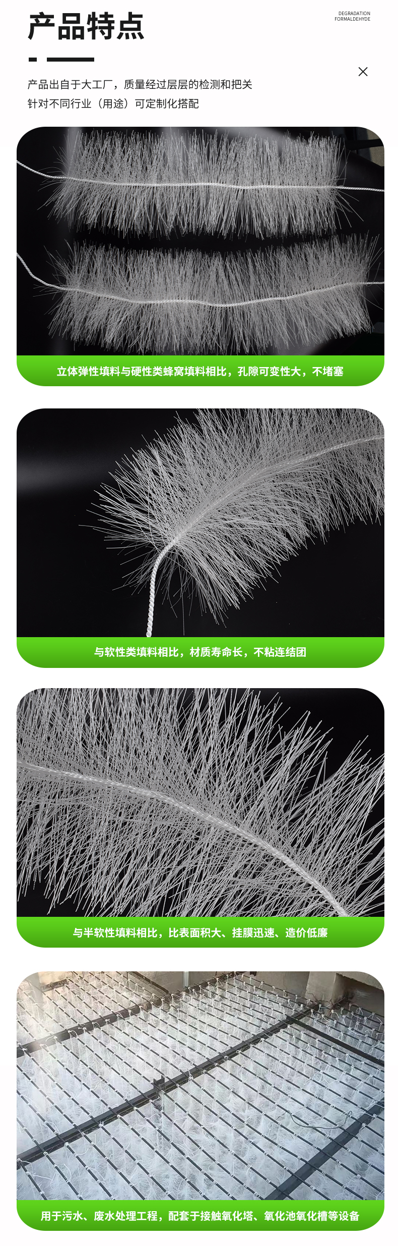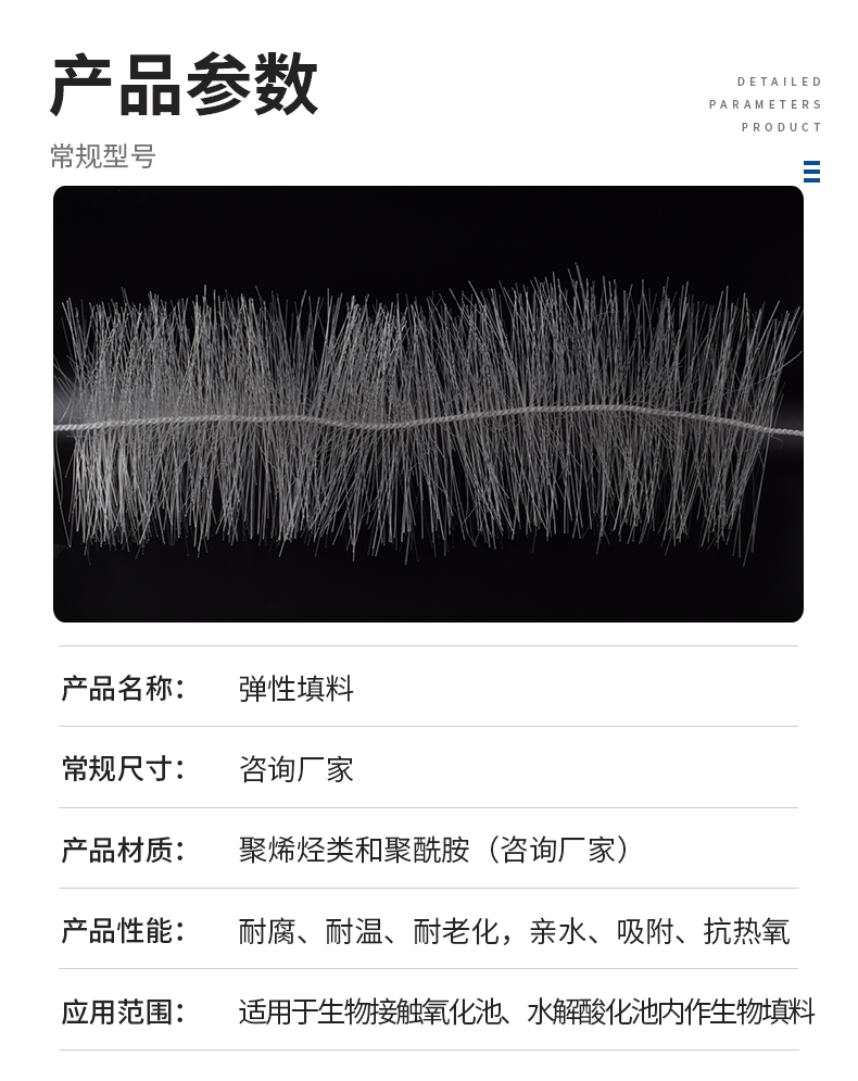 采用特殊的拉絲,絲條制毛工藝,將絲條穿插固著在耐腐、高強度的中心繩上,由于選材和工藝配方精良,剛?cè)徇m度,使絲條呈立體均勻排列輻射狀態(tài),制成了懸掛式立體彈性填料的單體,填料在有效區(qū)域內(nèi)能立體全方位均勻舒展?jié)M布,使氣、水、生物膜得到充分混滲接觸交換,生物膜不僅能均勻的著床在每一根絲條上,保持良好的活性和空隙可變性,而且能在運行過程中獲得愈來愈大的比表面積。