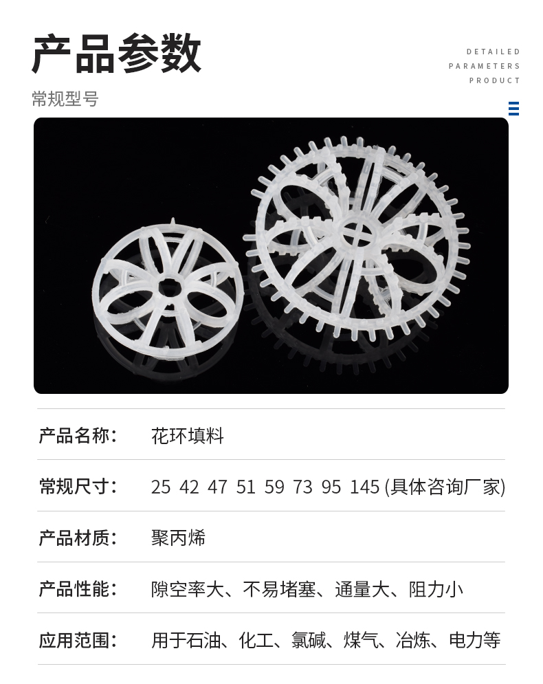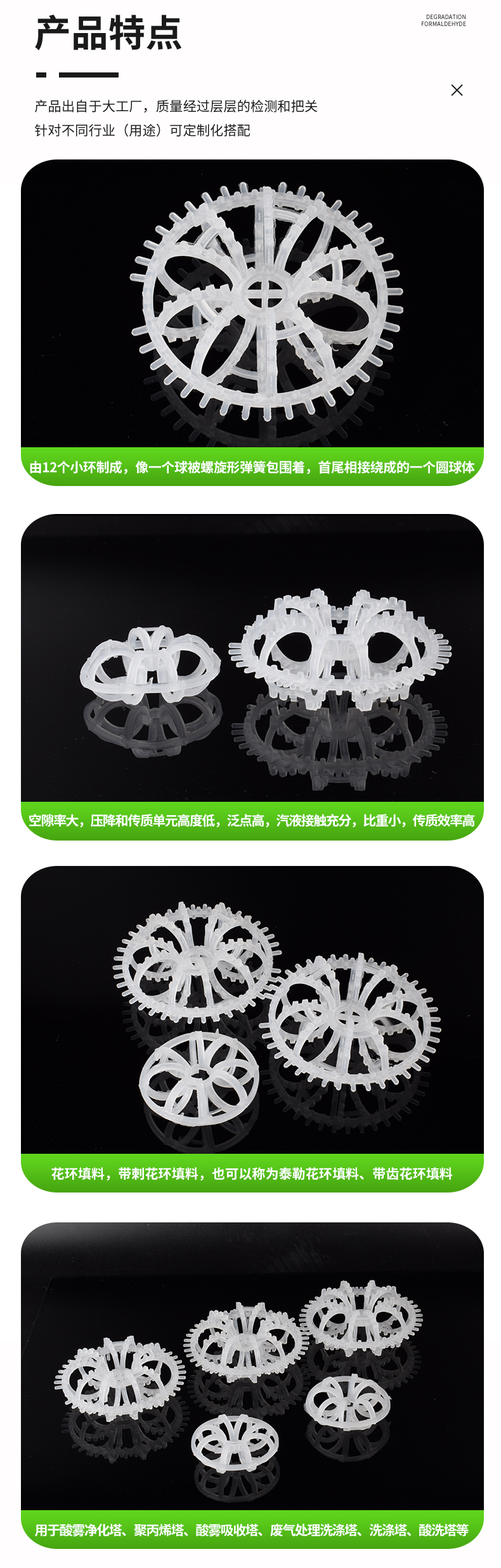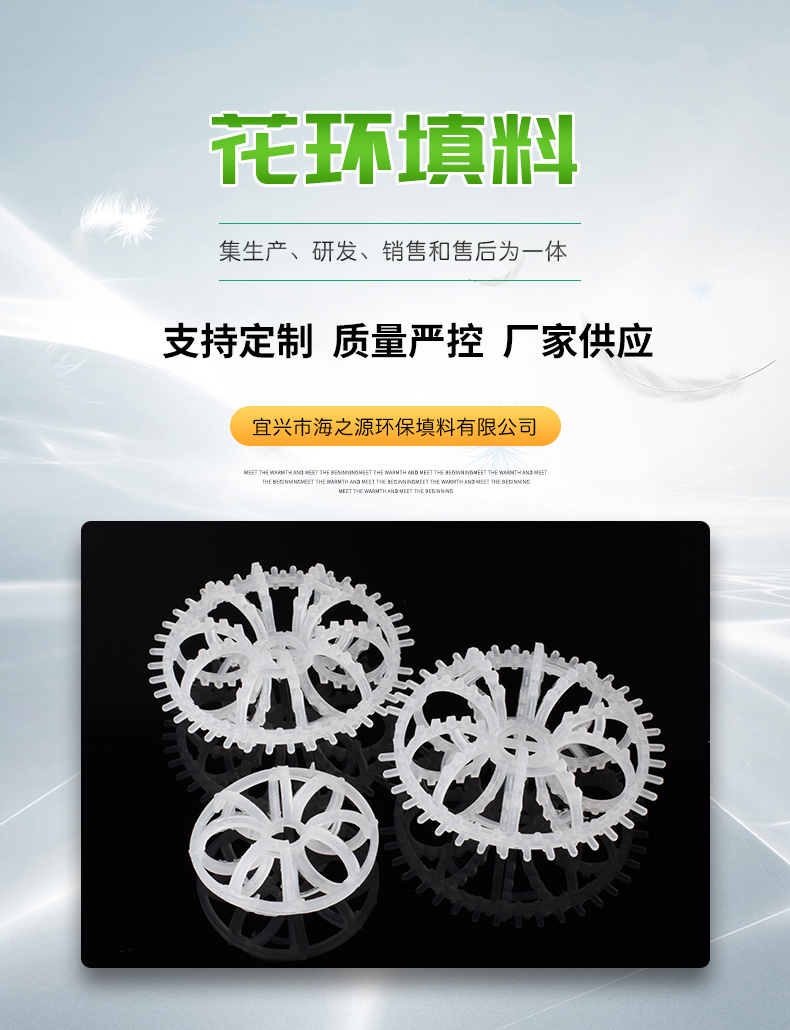 花環(huán)填料也稱梅花環(huán)填料是由許多圓環(huán)結(jié)繞而成,由于這種填料的間隙處能有較高的滯液量,可使塔內(nèi)液體停留時間較長,從而增加了氣液的接觸時間,提高了填料的傳質(zhì)效率。具有空隙率大,壓降和傳質(zhì)單元高度低,泛點高,汽液接觸充分,比重小,傳質(zhì)效率高等特點,多用于氣體洗滌、凈化塔中。