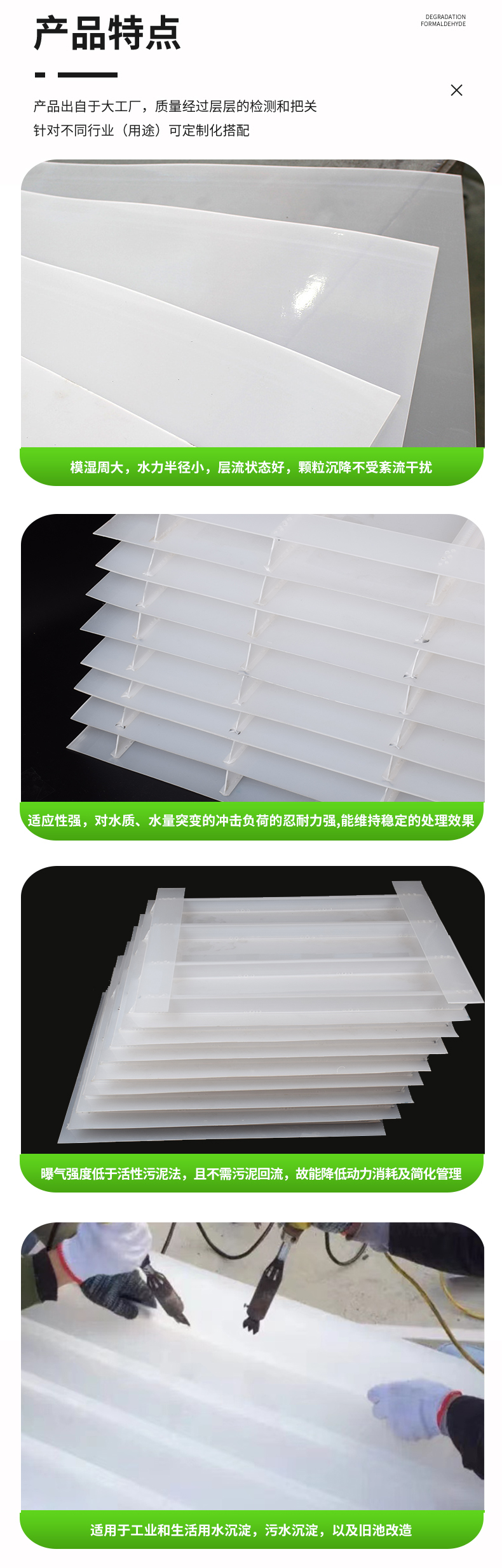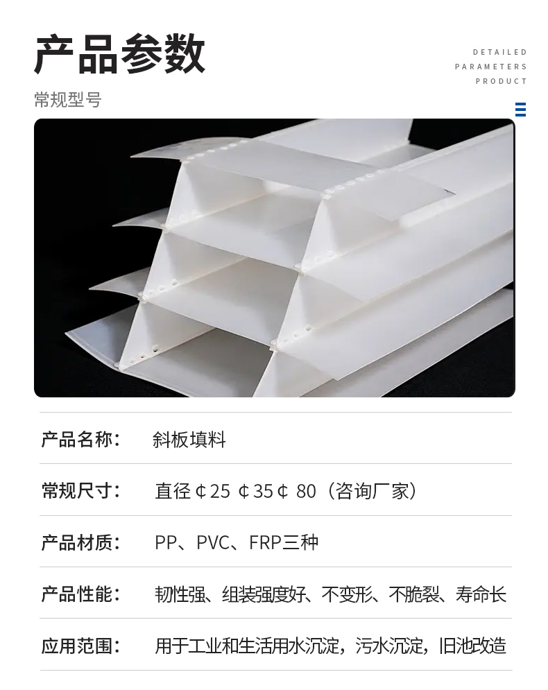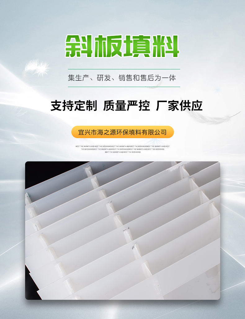 斜板填料、乙丙共聚斜板填料、小間距斜板填料主要由乙丙共聚材料加工制成。在淺層理論的基礎(chǔ)上,在斜板上部設(shè)置沉淀距離合理的沉淀段,在下部控制斜板的幾何形狀,使斜板下部形成穩(wěn)定的接觸絮凝段,通過接觸作用和淺池沉淀機理達到礬花與水分離的目的。 斜板填料按構(gòu)造型式可分為:①小間距斜板填料  ②接觸絮凝斜板填料  ③復(fù)合斜板填料。